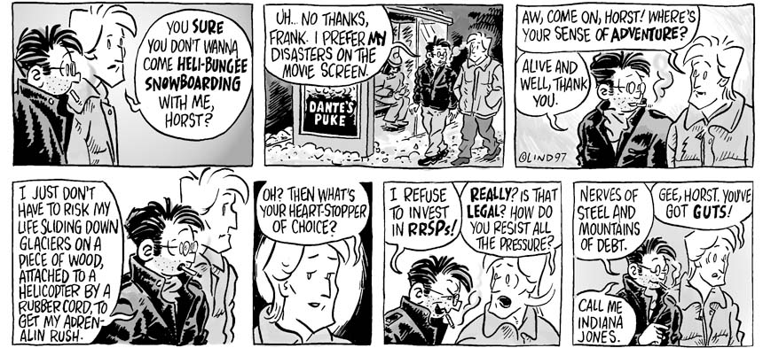 Frank invites Horst to go heli-bungee snowboarding wih him. And the extreme games have beguns.