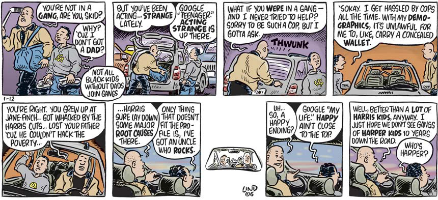 You can see a more extensive portfolio of my work at the blog lindtoons.com, including This Bright Future, a distilled and partial continuation of Weltschmerz, Turtle Creek, a daily comic about a turtle and a computer, and Footprint in Mouth, a quarterly cartoon I draw for Alternatives.