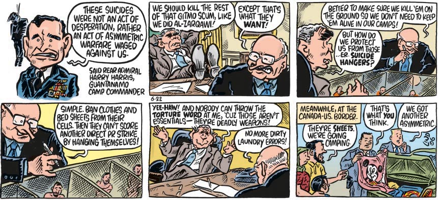 This was one of those instances where the cartoon wrote itself, arising from that first quote by the Guantanamo Camp Commander. The idea of warfare being waged by prisoners who have been locked up without charge or hope for over four years and tortured is bizarre. For those who missed it, this Guardian article gives good background on Guantanamo and the American propaganda war (in a questionable PR move, they called the suicides "a good PR move").