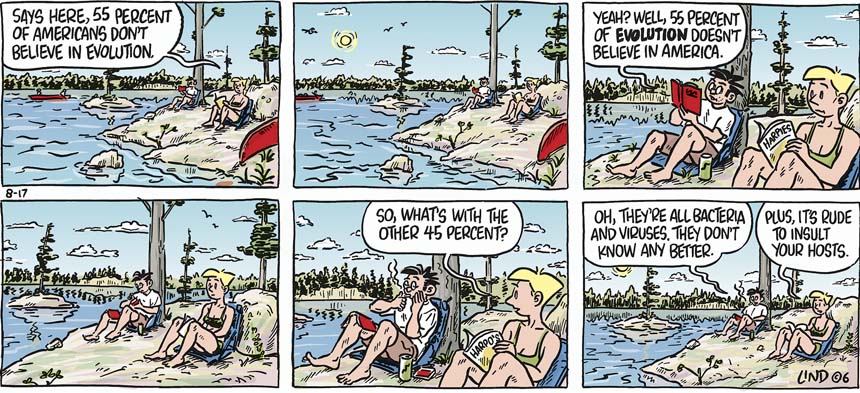 Then, because I liked the "it's rude to insult your hosts" punchline so much, I transferred it into Weltschmerz last year, meant to be banked so that I could get away on a camping trip of my own (it would be a shame if only my cartoon characters get to go). But Hurricane Katrina struck and I was leery of running it in case an outbreak of cholera made it seem like I was making fun of the suffering American hosts of that disease (this is the cartoon I drew instead). So I held the cartoon for this summer. As you read this, I'm just back from the glorious rocks and waters of Georgian Bay, mulling over next week's strip.
