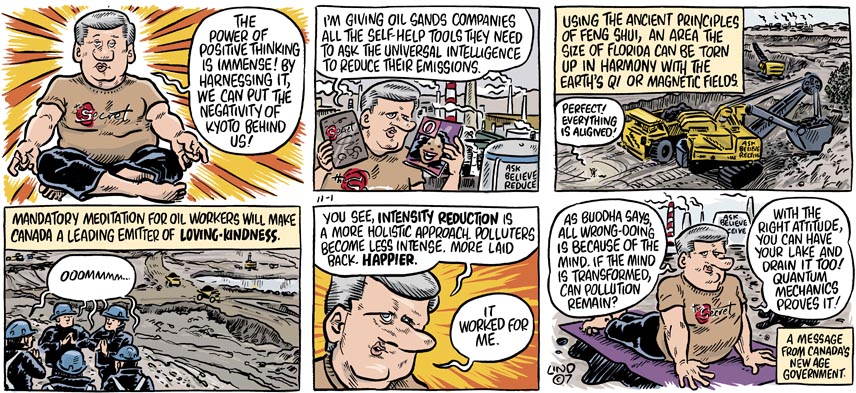 But the landscapes created by our machines are hell on Earth. I am planning number of cartoons on Alberta's oil sands, so I won't rant too much here. The more I read about what oil companies are doing in Athabasca, the more ghastly Canada's economic dependence on this wanton destruction looks. As Rick Salutin wrote last Friday: