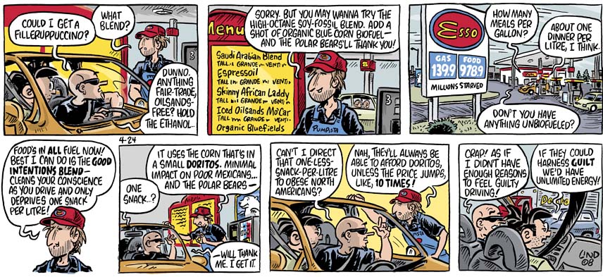 You read it here first: In May 12, 2005, I published a cartoon that modestly proposed using liposuction-harvested human fat as a biofuel. Now it has come to pass: The skipper of a boat in the Earthrace has used the fat of the skipper, Pete Bethune, and three volunteers to create 10 litres of biofuel to power his boat 15 km. (The rest of the distance will be powered by non-human biodiesel.) Read the Star article here.