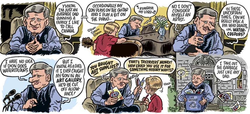 I wrote this cartoon three weeks ago, when my frustration built to a point where I felt I had no choice. But it took three weeks to get it done - and example of what happens when there's no publication deadline breathing down my neck. Then, today, Stephen Harper announced a $500 tax credit for kids' art eduction. To show he really does care about the arts. It's not much money -- the most you'll actually see back is $75. But it looks good, just like the daycare cheques. Harper seems to love to run a rebate, not a government.